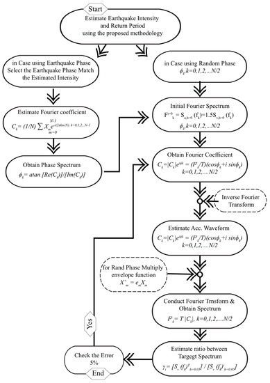 The recommended UHS is the acceleration response spectrum of 5% damping in the engineering bedrock (Vs = 292 m/s) level, with the probability of exceedance of 39%, 10%, 5%, and 2% over the 50 years. In case the intensity (PGA) of the probable earthquake is not matching the intensity of the recommended UHSs, the interpolation technique is used to generate the appropriate response spectra. Figure 11 illustrates the steps required to generate spectrum-compatible ground motions using the Fourier and phase spectra, following the algorithm developed by one of the authors, STERA_WAVE [36]. For the phase spectrum, corresponding to the PGA intensity of the estimated probable earthquake in the project lifetime, the historical earthquake has been carefully selected from Table 5, which has a similar PGA. The sequence of the selected phase spectrum to generate the sampled earthquake ground motion in each case is presented in Figure 12. In the case that the probably estimated intensity is smaller than 250 gal, the uniform random phase angle is adopted, and the ground motion is generated by multiplying the envelope function proposed by Jennings et al. [37].