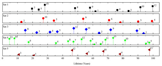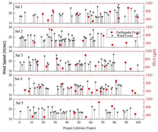 Five random sets of timelines are developed from the earthquake and wind events of different return periods, as discussed in previous sub-sections, and presented in Figure 14. In each set of timelines, an average of ten earthquakes of different PGA (range from 250 to 1100 gal) is anticipated, where the earthquake events’ details and sequence are summarized in Table 5. Similarly, in each set of timelines, an average of 43 wind events (range from 16 to 31 m/s) is expected to occur.