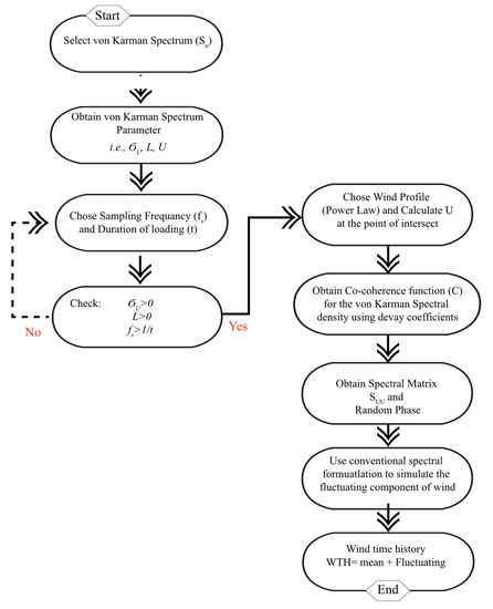 where dj is the distance of two referenced nodes of Euclidian distance, Su is the power spectral density of turbulence in the longitudinal direction of a single point, and Cij is the decay coefficients. The current work employed the decay coefficients from the Norwegian Public Roads Administration (NPRA) Handbook N400 [38], and the power law is employed as well to estimate the wind speed force at story levels. Furthermore, the conventional spectral method introduced by Deodatis and Shinozuka (1991) [39] and Deodatis (1996) [40] is adopted to estimate the fluctuating component of wind load by simulating the multivariate random process in the time domain. The entire process discussed in this section is further illustrated in the flowchart, see Figure 13, and the corresponding parameters are summarized in Table 6.