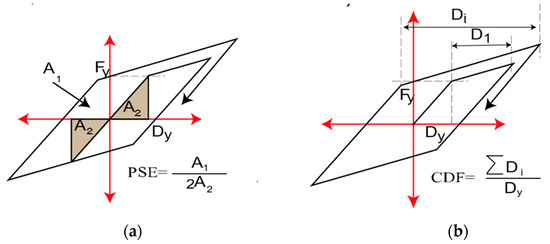 (a) Plastic strain energy (PSE); (b) cumulative ductility factor (CDF).