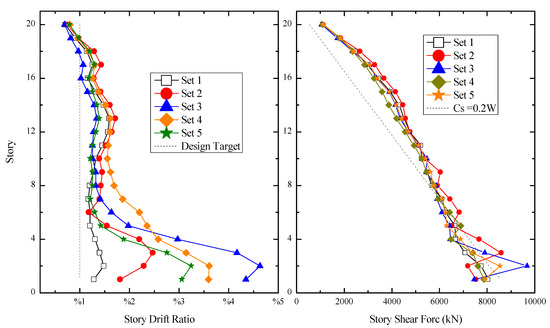Figure 16 presents the envelope of maximum story drift and shear force of the target building under the five sets of multi-hazard scenarios. Comparing the maximum story drift ratio with the design target of 1%, the maximum story drift obtained from multi-hazard timelines is 2.0–5.5 times larger than the design target. Although the story drift amplification for the lower story in contrast to the upper story is three times larger, the upper stories are not able to endure the design drift as well. In addition, the distribution of the maximum story shear force is approximately equal to the distribution of the story shear force (dotted line) when the seismic base shear is CS = 0.2 W, where W is the weight of the building.