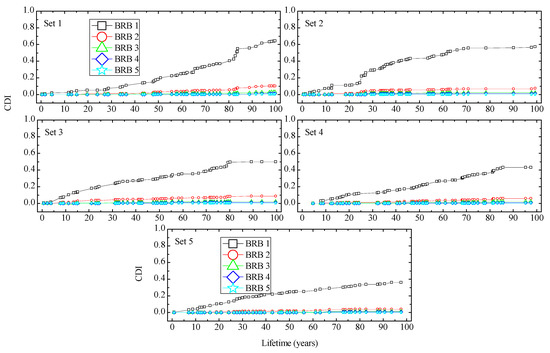 Figure 17 demonstrates the increase in cumulative damage index (CDI) for the selected BRBs under the application of five sets of multi-hazard scenarios. As indicated in Table 1 and Table 7, the estimated CDI for BRB#1–5 with an average strain amplitude of 0.05, 0.03, 0.025, 0.02, and 0.01% is about 0.64, 0.1, 0.03, 0.015, and 0.005, respectively, which indicates that CDI is decreasing in upper stories. Accordingly, none of the selected BRBs are reaching the failure status (CDI = 1.0) according to Miner’s rule.