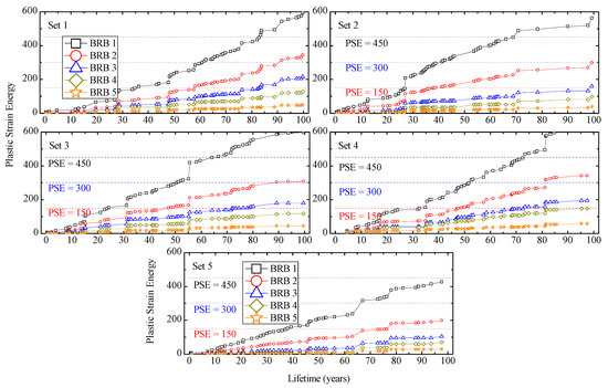 Figure 18 presents the increase in estimated plastic strain energy (PSE) for the five selected BRBs under the successive analysis of multi-hazard scenarios. Since the PSE of BRB is associated with the R factor as PSE = 150 R [48], for a certain (R = 1, 2, 3, and 4), the PSE is marked to illustrate the BRB’s progress damage. It is observed that the fatigue life of BRB#1, in terms of plastic strain energy, is about 25 years and 80 years for R = 1 and 4, respectively. Meanwhile, the estimated plastic strain for the BRB#5 (CDI = 0.005, R = 1) is below 150 after a service period of 100 years. In contrast to the CDI, the PSE reveals that even the BRBs with an average strain amplitude of less than >0.03% are prone to progressive damage under multi-hazard scenarios.