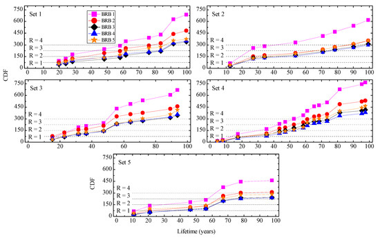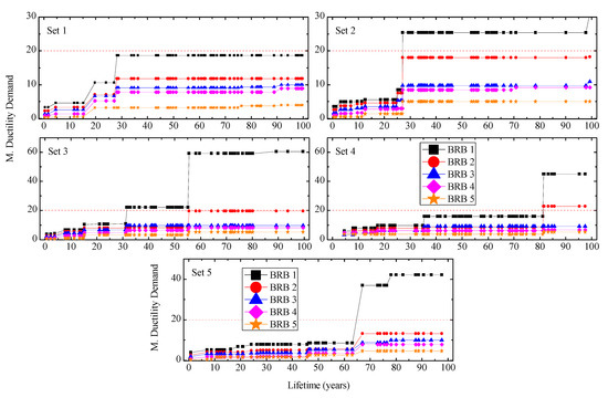 Figure 19 shows the increase in cumulative ductility factor (CDF) for the selected BRBs corresponding to the five sets of the multi-hazard scenarios. In the figure, the horizontal lines mark the CDF criteria according to Equation (18) for the certain R factors (R = 1, 2, 3, and 4, CDF = 75, 150, 225, and 300) to measure the progressive damage of selected BRB in terms of CDF. In contrast to the CDI and PSE, it is observed that all the selected BRBs are reaching their maximum capacity in terms of cumulative ductility factor. The effective age of the BRBs (with R = 4) is about 40–75 years corresponding to the BRB’s location in the high-rise building and average strain amplitude. On the other hand, the CDF capacity of the BRBs (with R = 1) is about 20 years, regardless of the average strain amplitude and damper location. Comparing the results of CDI and PSE with the cumulative ductility factor, it is important to point out that the BRBs that satisfy the CDI and PSE indexes are severely prone to progressive damage in terms of CDF. Therefore, the current study recommends precisely evaluating the fatigue life BRBs under different multi-hazard scenarios in terms of different fatigue criteria.