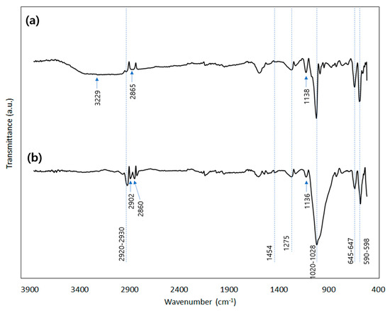Fe-CMB and Sb(V)-adsorbed Fe-CMB displayed several distinctive peaks, as shown in Figure 2. The broad band at 3229 cm−1 corresponds to the O-H bending vibration [10]. The peaks observed at 2920–2930 and 2860–2865 cm−1 correspond to the methylene C-H asymmetric/symmetric stretch, while the peak at 1454 cm−1 also corresponds to the methylene C-H bend [26]. The peaks at approximately 1135 and 1020–1028 cm−1 represent the skeletal C-C vibrations [26]. The peaks near 600 cm−1 are attributed to O-H out-of-plane bending [26]. The peaks observed between 650 and 1275 cm−1 are ascribed to ≡Fe-O [27]. The changes in the peaks after Sb(V) adsorption differ from those in previous studies, where Sb(V) was removed using metal oxides. McComb et al. [28] reported that the intensity of the peaks at approximately 1100 and 3200 cm−1 increased while Sb(V) was adsorbed onto iron oxide by inner-sphere complex with the contribution of hydroxyl groups from adsorbed antimonate. Although the results of this study were dissimilar to those of a previous study [28], peak improvement at 1020 cm−1 evidently indicated the adsorption of Sb(V). The peak at 1020 cm−1 is generated by the δ(OH) of hexahydroxyantimonate salt, which may probably be enhanced by the adsorption of Sb(V) [27]. This suggests that Sb(V) is adsorbed onto Fe-CMB via electrostatic attraction or ion exchange.