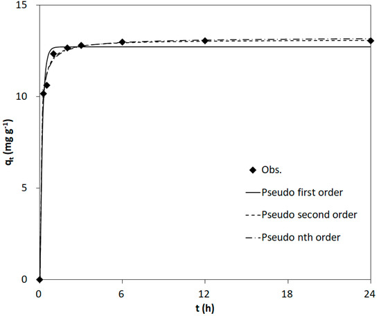 The kinetic data were analyzed using pseudo-first-order (Equation (1)), pseudo-second-order (Equation (2)), and pseudo-nth-order (Equation (3)) models, and the equations are as follows [24]: