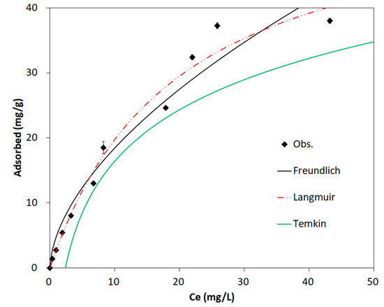 Langmuir (Equation (4)), Freundlich (Equation (5)), and Temkin (Equation (6)) models were employed to analyze the equilibrium data, and the equations are as follows [25]: