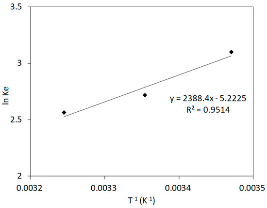 where ΔG0 is the change in Gibbs free energy (kJ/mol), ΔS0 is the change in entropy (J/mol/K), ΔH0 is the change in enthalpy (kJ/mol), R is the gas constant (J/mol/K), Ke is the equilibrium constant (-), T is the absolute temperature (K), and α is the amount of adsorbent (g/L).