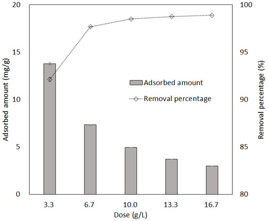 The amount of Sb(V) adsorbed amounts per unit mass of adsorbents and the removal percentage under different amounts of Fe-CMB are presented in Figure 6. With an increase in the Fe-CMB dose from 3.3 g/L to 16.7 g/L, the amount of Sb(V) adsorbed per unit mass of Fe-CMB decreased from 13.8 mg/g to 3.0 g/L, because the adsorption sites present on the adsorbent surface were not fully occupied by adsorbate [19]. However, at higher Fe-CMB doses, the removal percentage of Sb(V) increased because the increase of adsorbent dosage provided more available sites for Sb(V) adsorption, thereby leaving less residual concentration of Sb(V) in the aqueous phase [35]. Approximately 98.5% of Sb(V) could be removed by Fe-CMB at a dose of 10.0 g/L.