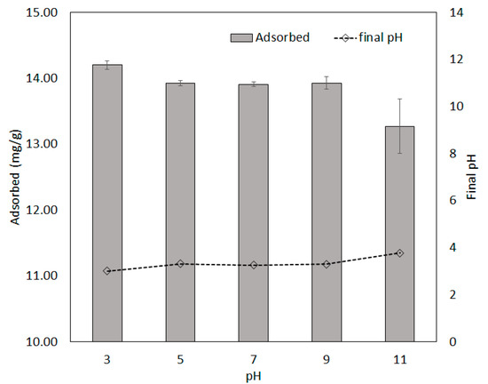 The Sb(V) adsorption by Fe-CMB as a function of the solution pH (3–11) is presented in Figure 7. The increase in solution pH reduced the Sb(V) adsorption from 14.2 mg/g to 13.3 mg/g. The solution pH profoundly affects adsorption by influencing the surface charge of the adsorbent and the metal species [9]. Sb(V) mainly exists as Sb(OH)6− in the solution with pH 2–10 [10], and Sb(V) favors a positively charged surface. The surface of the adsorbent becomes more negatively charged with increasing solution pH, causing repulsion between Sb(OH)6− and more negatively charged surfaces [9,10]. Furthermore, competing with OH− at higher solution pH also inhibits the Sb(V) adsorption. The Sb(V) adsorption is generally higher under acidic conditions and relatively insensitive to solution pH. Although the solution pH increased from 3 to 11, the Sb(V) adsorption decreased by only 6.5%. Fe-CMB maintained its performance at a high pH, indicating that Fe-CMB can be applied to alkaline wastewater.