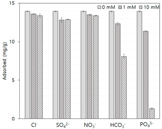 Several anions such as chloride (Cl−), sulfate (SO42−), nitrate (NO3−), bicarbonate (HCO3−), and phosphate (PO43−) often exist in natural water and wastewater, and they can negatively influence Sb(V) adsorption [9]. The influence of these anions on Sb(V) adsorption was investigated at two different molar concentrations, 1 and 10 mM, as shown in Figure 8. The reason for setting the anion concentration to 1 mM and 10 mM was to simulate natural water and wastewater, respectively [36]. The presence of Cl− and NO3− negligibly inhibited Sb(V) adsorption because compared to Sb(V), these ions bind less strongly to the adsorbents [9]. However, HCO3− and PO43− exhibited negative effects on Sb(V) adsorption, with reductions of 41.6% and 90.6% in the presence of 10 mM HCO3− and PO43−, respectively. The reduction of Sb(V) adsorption onto iron-based materials by competing anions, especially PO43−, has also been reported in other studies [2,37]. This phenomenon can be explained by the high affinity of PO43− to iron via the formation of inner-sphere complexes [38].