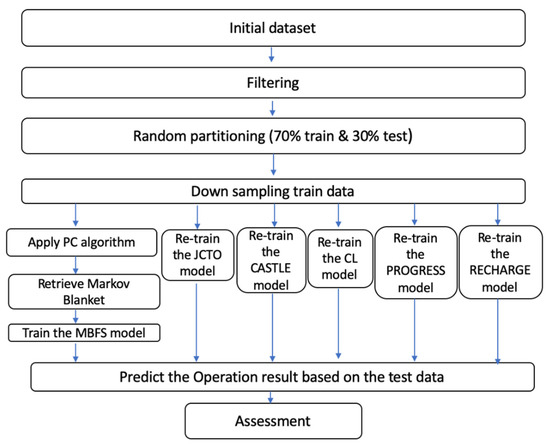 Next, the Markov blanket corresponding to the response variable was retrieved. All the variables that constituted the Markov blanket of the response were included as independent variables in a multivariate binary logistic regression model with the operation result as the dependent variable. This model was trained on the downsampled training dataset, resulting in the so-called Markov blanket for feature selection (MBFS) model.