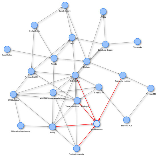 The current study is based on the largest database available worldwide (EuroCTO Registry), which consists of 29,995 cases referring to the period 2008–2018 (including demographic data, clinical, anatomic, procedure parameters, etc.). The motivation in this study was to assess the dynamics of causal models and causal discovery, using observational data, in predicting the result of the PCI. Causal models are used for the first time in this context to the best of our knowledge. Current approaches are mainly based on standard regression analysis and standard correlation assessment, to detect the most appropriate predictor variables for the response variable of interest. Causal models, on the other hand, aim to discover the cause–effect relationships between variables. The focus in this paper was to find and use the local causal structure around the response/target variable (i.e., operation result) to predict its outcome, particularly the so-called Markov blanket. By definition, the Markov blanket of a variable T is the minimal variable subset conditioned on which all other variables are probabilistically independent of T. The Markov blanket of T consists of the variables representing its parents, children, and other parents of its children in the graph (spouses). Using the Markov blanket of the response variable constitutes one of the emerging successful filtering approaches in variable selection [8].