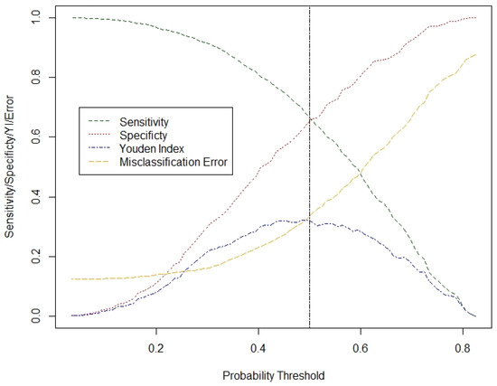 Figure 3 shows the tradeoff between sensitivity, specificity, Youden index (sum of sensitivity and specificity minus one), and misclassification error for different prediction probability thresholds. It is displayed that at the standard threshold of 0.5, the curves corresponding to sensitivity and specificity almost cross each other, thus resulting in very similar values (66.62% and 65.43%). At the same time, the Youden index approximately receives its maximum value (0.3205). On the other hand, the misclassification error is 33.44%, which is higher than its minimum value (12.44%), corresponding to prediction probability threshold equal to 0.035 (which is clearly, however, very close to zero). The reason for this is that in the test dataset, the class imbalance in operation success still exists, thus, decrease in sensitivity results in higher values of misclassification error, despite the larger increase in the specificity. Assuming that it is of equal interest to correctly predict both the successful and unsuccessful operation results, a slight increase of the misclassification error is acceptable provided that high values of specificity are achieved.