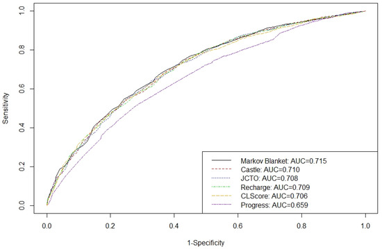 The results of the comparison among the MBFS model and the models JCTO, CASTLE, RECHARGE, CL, and PROGRESS are shown in Table 3 and Figure 4. In Table 3, the number of the features is displayed for each model, along with their specific names, the AIC value obtained based on the corresponding logistic regression model (downsampled training data), and the AUROC value (test data). The differences among the models are small, which has already been noted, among else, in [17]. The proposed MBFS model is the best one in terms of both the AIC (exhibited minimum value) and the AUROC (exhibited maximum value), compared to all the remaining models. Particularly, the MBFS model exhibited an AIC value of 3751.7, compared to (in increasing order) 3760.6 (JCTO), 3774 (CASTLE), 3774.1 (RECHARGE), 3841.7 (CL), and 3915.1 (PROGRESS). At the same time, the AUROC with the MBFS model was 0.715, compared to (in decreasing order) 0.710 (CASTLE), 0.709 (RECHARGE), 0.708 (JCTO), 0.706 (CL), and 0.659 (PROGRESS). Note that this is not a strict ranking of the above models, since the JCTO, CASTLE, RECHARGE, CL, and PROGRESS models are used in a different way than in the original articles, and mainly as feature selection tools in this study. In Figure 4, it is visually exhibited that the AUROC corresponding to the MBFS model surpasses all other models.