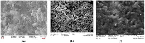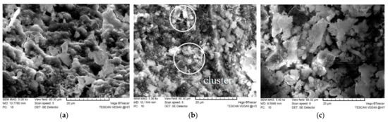 SEM images of the plain concrete in different corrosion humidity: (a) no corrosion, (b) humidity 71% (time 21 days), and (c) humidity 85% (time 35 days).