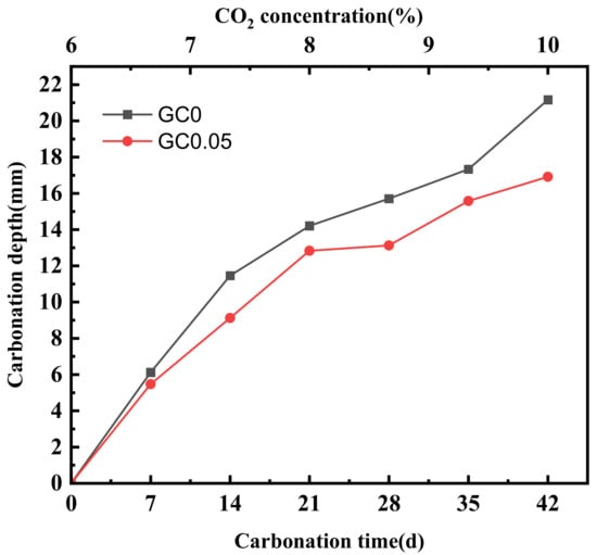 By measuring the carbonation depth of GC0 and GC0.05 at 7, 14, 21, 28, 35, and 42 days, the influence of the CO2 concentration change on the concrete carbonation depth was speculated.