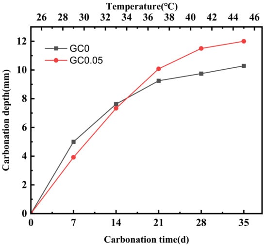 The relationship between the carbonation depth of GC0 and GC0.05 with temperature is shown in Figure 7.