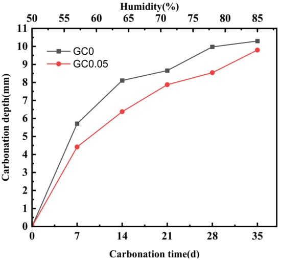 The relationship between the carbonation depth of GC0 and GC0.05 with different humidity is shown in Figure 10.