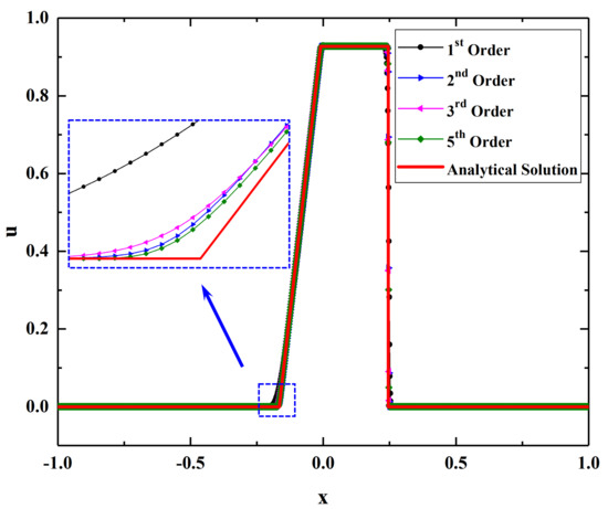 Figure 2 shows the velocity profiles at time t = 0.14, and all the numerical results are kept consistent with the analytical solution, which also indicates that, the higher the reconstruction order, the better the simulation results will be get.