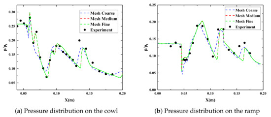 Reinartz [1] mentioned that, for the flow at the central section of the two-dimensional inlet/isolator, the 3D effects of the side wall can be ignored. So, in this part, a 2D simulation based on RANS is performed. In order to complete the grid independence verification, this paper solves three sets of meshes with different sparsity, as mentioned in the last section “Mesh and Boundary Conditions”, by using the compressible RANS-based CFD solver developed: combine the 3rd-order MUSCL reconstruction scheme, the AUSM flux computation scheme, the SST turbulence model and the LU-SGS steady-state time integration approach. The simulation results of different meshes mentioned in Table 1 are shown in Figure 7: all the results are in good agreement with the experimental test, and the simulation outcomes of the medium and fine mesh are almost the same, with only slight differences, so in the subsequent computations, the medium mesh is adopted.