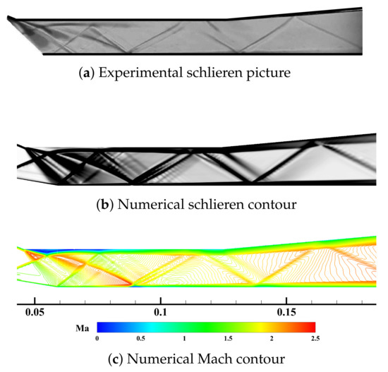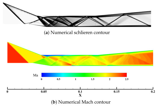 It can be seen from Figure 8 that the wave system inside the intake duct is highly complicated. The oblique shocks are reflected multiple times inside the isolator, and there are strong interactions of shock waves/expansion waves and shock waves/turbulent boundary layers, leading to obvious flow separations near the throat of the inlet. By the comparison of Figure 8, the shocked flow field structure obtained through numerical simulation is basically consistent with the experimental test results, and the pressure distribution is also roughly the same as the test of Figure 7. However, there are some small deviations between them: it can be seen from Figure 7 and Figure 8 that, in the rear part of the isolator, the simulation results show that the oblique shock incident point is slightly farther back, and comparing the experimental Schlieren picture and the computation results, it can be found that the simulation’s boundary layers are thinner and the separation near the throat is smaller.