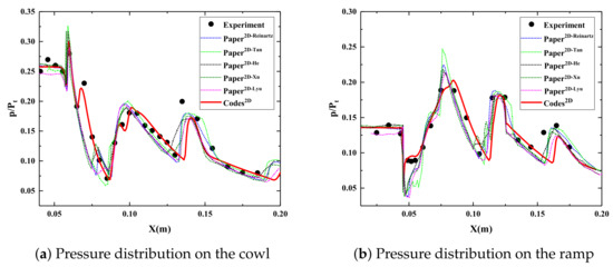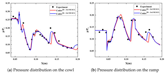 (1) The high-order reconstruction schemes can accurately capture the details of the flow field, which is particularly important for computing the SWTBLI. In this work, by combining the currently widely used turbulence model SST with the 3rd-order MUSCL or the 5th-order WENO/MP reconstruction scheme, the accurate capture of the shocks’ positions inside the inlet/isolator was realized, and the simulation results of the pressure distribution on the cowl/ramp were obtained and were found to be highly consistent with the experiment;