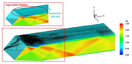 The 2D computation of the inlet/isolator is a simplified ideal case. In reality, the 3D effects of the side wall may cause unstart under some extreme conditions. Therefore, a 3D computation is performed to compare the 2D/3D simulation results based on RANS. The generation of 3D computation’s mesh is based on the 2D medium mesh, and it is divided into 100 layers in the thickness direction, which are also refined near the side wall, ensuring the of the first layer equals to 1. As shown in Figure 12, there is a strong rolled-up lateral flow near the sidewall of the inlet throat, which also interacts with the separation area at the ramp, and the flow inside the separation bubble is relatively disordered: the flow distribution in the Z direction is extremely uneven, and the 3D effects are quite obvious. Through Figure 13, it can be seen more intuitively that the 3D computation results are closer to the experimental test, which are all extracted from the central plane in Z direction.