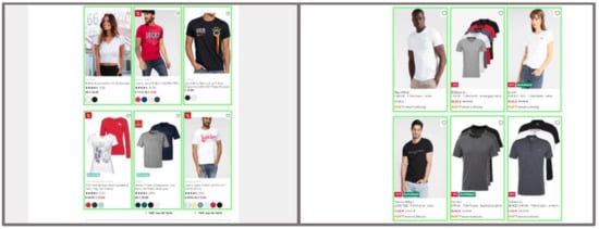 When selecting the online shops for the screenshots, care was taken that they would allow analysing the factors expected to influence visual attention, i.e., spatial location and the inclusion of human images. In both online shops, product depictions were arranged in a table-like manner with three columns and multiple rows (online shop A 16 rows; online shop B 28 rows), and both online shops included human models in some of their product depictions (cf. Figure 1). In online shop A, 75.0% (36 out of 48) of the product depictions involved a human model wearing the T-shirts, online shop B included human models in 58.3% (49 out of 84) of the product depictions. To enable quantitative analysis, each product depiction was defined as an area of interest (AOI). Each AOI was uniquely labelled, with the label containing the name of the website, row and column number and whether a human model was depicted. Within each stimulus, all AOIs were set exactly to the same size, with all AOIs of online shop A having a width of 274 px and a height of 560 px, and all AOIs of website B having a width of 308 px and a height of 560 px.