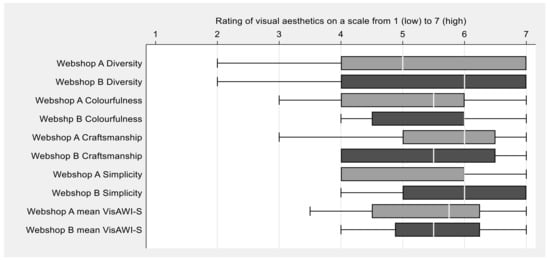 Figure 2 presents the participants’ assessment of the facets of visual aesthetics. For both web-shops, the median of all facets was at least at the value of 5, meaning that it was always above the mean value of the scale. All Wilcoxon signed-rank tests were non-significant (Diversity z = −0.98, p = 0.33; Colourfulness z = −0.53, p = 0.60; Craftsmanship z = 0.17, p = 0.86; Simplicity z = −1.88, p = 0.06; mean VisAWI-S z = −1.33, p = 0.18), indicating that online shop A and online shop B did not differ in terms of visual aesthetics.