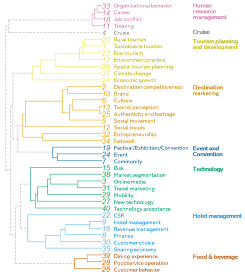 Table 2 and Figure 1 illustrate the characteristics of the research topics discovered in this study. The dendrogram in Figure 2 depicts the hierarchical structure of the research topics and summarizes the relationships among them. The horizontal axis represents the dissimilarities between topics. The short height of the horizontal axis connecting two topics indicates that these topics have a high correlation and share high similarities, while the long axis indicates a low degree of correlation between them. Eight clusters were discovered with 40 topics, including the standalone cluster (Cluster 2; Cruise). Of the eight clusters, Cluster 4 (destination marketing) was the most popular as the subtopics accounted for 26.5% of the topic proportion. Cluster 3 (tourism planning and development), which consists of seven topics, had the second-highest topic proportion. In particular, Topic 21 (economic growth) had the highest topic proportion, meaning that much research related to this topic has been conducted.