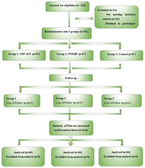 A total of 201 patients participated in this double-blind randomized controlled trial; patients were randomly and equally divided into three groups of 67 patients in each. There were three dropouts: one subject from each group. One subject from group 1 dropped out for an unknown reason and subjects from groups 2 and 3 dropped out due to severe sensitivity. The other 66 participants were available for the recall at 24 and 36 h of the study. Patients in group 1 applied CPP-ASP as the desensitizing agent, while group 2 used PNSMP, and group 3 applied placebo gel after in-office vital bleaching (Figure 1).