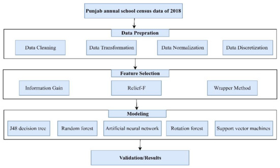 The traditional cross-industry standard process for data mining (CRISP-DM) was utilised to predict the performance of schools, as shown in Figure 1. The methodology consists of dataset collection, data preparation, modelling, and validation of results. Firstly, Punjab annual census data were obtained from the official website. Secondly, data preparation techniques were applied, i.e., data cleaning, data transformation, data normalisation, and discretisation. Thirdly, various feature selection techniques were utilised to extract significant features. Fourthly, various machine learning classifiers were employed to train the model. Lastly, different performance measures were utilised to check the performance of classifiers. Microsoft Azure Machine Learning Studio and WEKA were utilised for data analysis, preparation, and modelling.