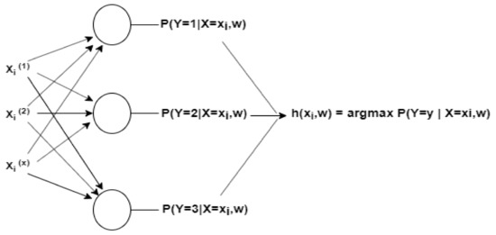 ANN has been used for both supervised and unsupervised learning. This study applied supervised learning because the input and output were known and provided to the model. The model was tuned with different values to adjust the weights to the best to obtain the expected efficient output [35]. In multiclass classification, classifiers are used to predict multiple outcomes. In this study, a multiclass neural network was used to build a classification framework. Let us have K classes and want to classify one instance from one class. Then, the best choice is to use a linear neural network with multiclass classification. It is an extension of the binary classification setup. The second layer node will generate output as 0, 1 … K-1. The basic working principle of a multiclass artificial neural network is shown in Figure 2.