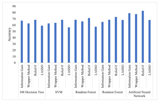 Among the five classifiers utilised in this study, the artificial neural network outperformed and obtained the highest accuracy of 82.9% while utilising the relief-F based feature selection technique, as shown in Figure 3. It was observed that ANN also performed efficiently while utilising other feature selection techniques. The performance of ANN was also good while evaluating other performance metrics.