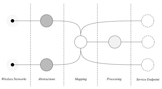 Some platforms allow communication between elements inside the deployed system. This is visualized using N*N*. Flows that end with a single N* or X* provide elements that have a single output. Contrarily, flows that employ an N*N* approach provide reusable components for every node that can be integrated in the platform, i.e., every element has multiple inputs and outputs. An N*N* approach is illustrated in Figure 1, where the message can be passed back and forth between Abstractions, Processing elements and elements that provide platform interoperability at the Service Endpoint.