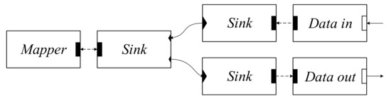 FLINT supports three types of adapters—I/O adapters, processing adapters and direct adapters. I/O adapters use their agent port to fetch data from a data source or push data to a destination. Processing adapters, on the contrary, do not use their agent ports and return the data to the sink after processing. Figure 3 shows how the different types of adapters work in a simple configuration. Data coming from a data source is captured using the input port of the Data in agent. The corresponding element forwards the data to the Mapper adapter. This is a mandatory processing adapter responsible for data delivery to the next adapter in the chain. Incoming data are passed to the agent and distributed over one or more outputs. The Data out I/O adapter can perform extra processing to match the format of the data source it is connected to or immediately forward the data to the destination.