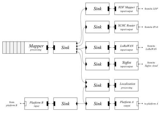 FLINT uses the Mapper adapter as a hub for data distribution. The Mapper is a simple processing adapter with multiple sink inputs and outputs. Incoming data are processed on a per-device basis. The agent matches a device’s Medium Access Control (MAC) address with an adapter based on the input topic. A routing scheme is constructed from the configured information for a particular device. The sink then forwards the original payload and the routing scheme to the next adapter in the chain. From there, based on the routing scheme, the processed packet is distributed to the next hop.