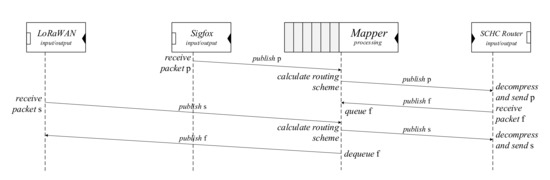 The lowest level of interoperability that FLINT can guarantee, is device and network interoperability. Device interoperability ensures that high-end IoT devices, such as smartphones, can communicate with resource constrained, low-end IoT devices [4]. The Mapper interface provides a queue and supports bidirectional communication over multiple network interfaces. Both low-end devices and high-end devices can exchange information using different communication technologies with diverse downlink patterns. Figure 6 shows an excerpt of the complete FLINT configuration that provides device and network interoperability for a low-end device with a Sigfox and LoRaWAN interface. The Sigfox adapter forwards packet p together with the device’s MAC address to the Mapper adapter. The routing scheme is calculated based on the information in the TD. Packets coming from these networks are SCHC compressed and forwarded to the SCHC router. This adapter handles requests to, and responses from, the IPv6 network. The response from the IPv6 network (packet f) is stored in the queue of the Mapper adapter, since downward traffic for these devices can not flow continuously. Finally, due to a network change, the device transmits packet s over its LoRaWAN interface. The Mapper adapter will immediately dequeue packet f and forward it to the corresponding LoRaWAN adapter. Packet s is also delivered to the SCHC router.