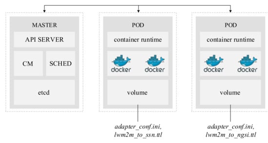There, a FLINT configuration uses RML to match different ontologies. The RML adapter uses a Turtle mapfile that describes the mapping. The Kubernetes configuration file is used to input the mapfile to the RML adapter that runs in a Node.js server instance. In a running system, this adapter can be replicated so multiple adapters can match the LwM2M vocabulary to various ontologies. This can be done by simply replacing the mapfile. Figure 8 shows two Kubernetes deployments that are managed by the Kubernetes master. A Kubernetes deployment represents an adapter and can be configured by mounting configuration files. In this example, the LwM2M data model can be translated to SSN by one adapter and to Next Generation Service Interfaces-LD (NGSI-LD) by another one. By simply replicating the adapter and mounting a different configuration file, the FLINT configuration can be expanded easily.