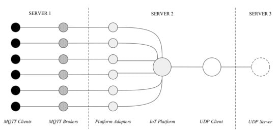 The experimental setup consists of three servers running Ubuntu 18.04 and are synced using the Network Time Protocol daemon (ntpd). All three servers have a gigabit Network Interface Card (NIC), 2 Hexacore Intel E5645 (2.4Gigahertz (GHz)) Central Processing Unit (CPU) and 24 Gigabyte (GB) Random Access Memory (RAM). One server is used to host the MQTT clients and brokers. Another to host the platforms and one to host the UDP server. Each IoT platform is configured to run in a Kubernetes cluster.