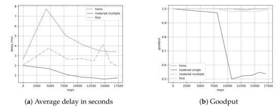 Excluded from the Figure are the very large delays for a single Node-RED instance. For completeness, these values are provided in Table 2. These high delays are due to the single-threaded design of the underlying Node.js instance [30]. Furthermore, the goodput for a Node-RED (single instance) application dropped significantly for data rates above 7500 messages per second, which can be seen in Figure 10b. To take advantage of multi-core systems, a cluster of Node.js processes can be deployed to handle the load. Therefore, six Node-RED instances were deployed and is referenced as Node-RED multiple. Every instance subscribes to a MQTT broker, processes the data and forwards it to the UDP server. This resulted in near-zero latency and a 100% goodput.