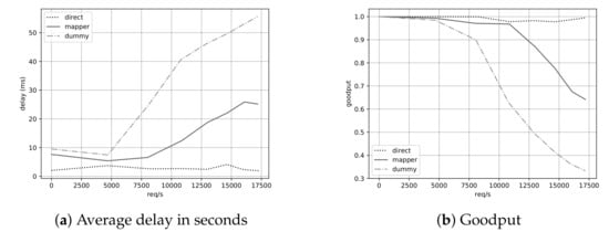 The above section used six direct adapters. This type of adapter forwards the data directly to another endpoint in the platform. However, the Mapper adapter can be used to forward data between several components. As shown in Figure 11, the average latency increases and the goodput decreases, since the message bus must process twice as many messages.