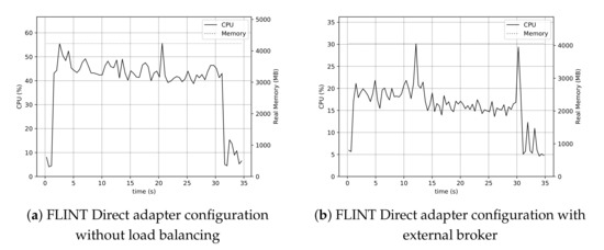 Finally, in Figure 12, two system configurations are presented in order to explore the impact of a very basic workload offloading approach. In Figure 12, a, every component runs on the same machine. This results in an average of around 45% CPU load and 4.5 GB memory consumption. In the second configuration, the MQTT broker was moved to a different machine. This resulted in an average of only 17% CPU usage and 4 GB memory consumption.