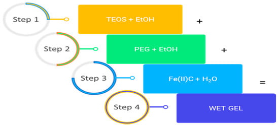 Fe(II)C and PEG were added to silica solution (the molar ratios for the silica matrix were H2O/TEOS = 26.6 and EtOH/TEOS = 6). After the gelation process was complete, samples were dried at 50 °C for 24 h, obtaining glass materials that were finely grounded. Figure 1 shows a flow chart of the sol-gel procedure used to synthesize the hybrid materials, which are summarized in Table 1. During the synthesis, the ferrous ions are stable, as the authors have shown in a previous paper [].