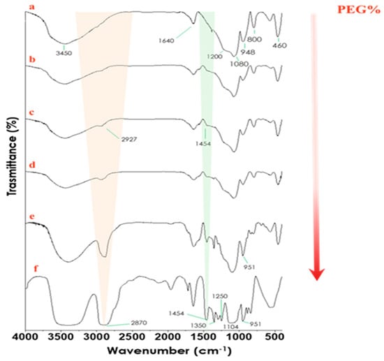 The formation of a sol followed by gelation, starting from inorganic materials as precursors, is the basis of the sol-gel technique. A three-dimensional network gel is formed via the condensation of hydrolysed species in solution. Parameters such as temperature, pH, water content, and precursor concentrations affect the structure of the initial gel and the properties of the material []. The main advantage of using the sol-gel method for biomaterial synthesis is the possibility of encapsulating different organic compounds and other bioactive molecules that can be used as carriers for drug delivery [,,]. Indeed, it has been reported that gels can release drugs (such as anti-inflammatory agents, antibiotics, and antitumor agents) in a controlled manner [,,,]. Sol-gel preparation can be done with a wide variety of precursors, but silica-based carriers are preferred because they are a well-known system, inexpensive, and biodegradable []. Moreover, it has also been reported that silica/PEG hybrids allow us to obtain greater elasticity, to avoid particle agglomeration, and to create a network that entraps many kinds of drugs and compounds in only one step [].