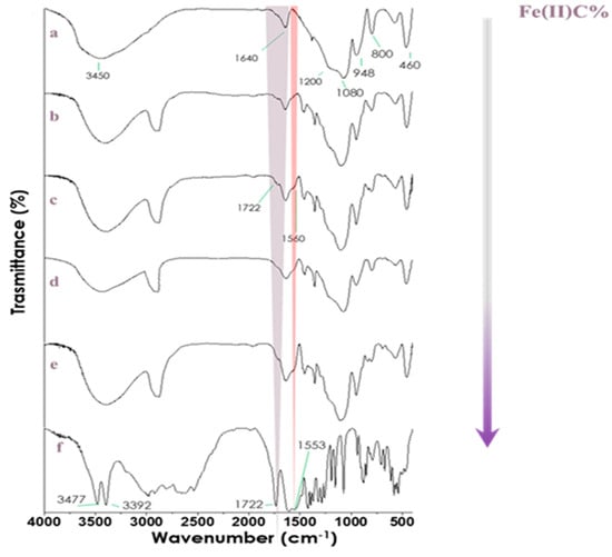 FTIR spectra of SiO2 (a), SiO2/PEG50%/Fe(II)C 5% (b), SiO2/PEG50%/ Fe(II)C10 % (c), SiO2/PEG50%/ Fe(II)C15% (d), SiO2/PEG50%/ Fe(II)C20% (e), and pure Fe(II)C (f).