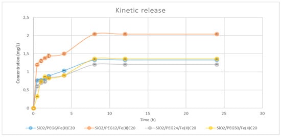 In particular, the amount of Fe(II)C released was very fast in the first 5 h, and then it slowed down, ending after 8 h. Furthermore, the 12 wt% PEG system released a higher concentration of Fe(II)C, likely because this is incorporated into the porous matrix of the system and is more easily released than when the PEG concentration is greater, and forms stronger interactions within the system.