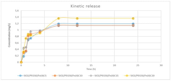 Fe(II)C release measurements were carried out to evaluate the hypothetical controlled release of the compound. Indeed, the results confirm that this system is able to release Fe(II)C in a controlled manner, because it was fast in the first few hours, and then it slowed down, ending after 8 h.