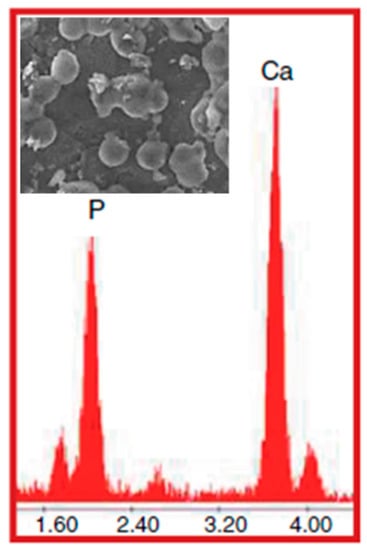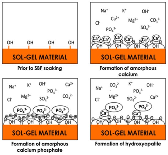 Glasses exposed to SBF solution for 21 days were observed via SEM. In Figure 6 it is possible to see some globules on disks that are soaked in SBF. This shape is typical of hydroxyapatite formed on a glass surface. Those particles were visible over the entire surface of all materials. The EDS analysis (Figure 6) of the observed crystals shows their chemical composition. The atomic content ratio between Ca and P is 1.6 and is in agreement with the chemical formula of hydroxyapatite []. The mechanism of the hydroxyapatite formation is explained in Figure 7: the Si–OH groups present on the surface of the material combine with the positively charged Ca2 + ions present in the SBF fluid, forming calcium silicate. The accumulation of calcium ions allows the increase in the positive charge on the surface which, in turn, combines with the negative charge of the phosphate ions to form amorphous calcium phosphate, which spontaneously transforms into hydroxyapatite [Ca10(PO4)6(OH)2] [].